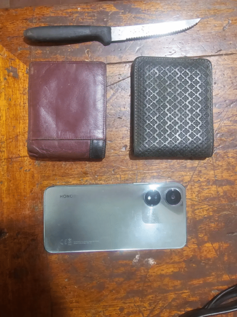Durante la requisa obligatoria, los agentes encontraron en poder de Elvis el celular marca Honor (azul océano) robado, la billetera verde de la víctima con sus documentos y un arma blanca (cuchillo) oculta a la altura de la cintura, la cual habría sido utilizada para el crimen.