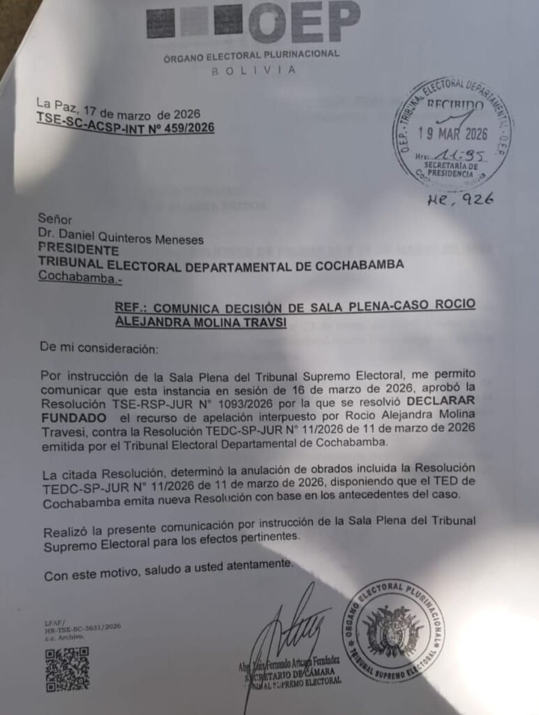 El Órgano Electoral comunicó su resolución al Tribunal Electoral Departamental (TED) de Cochabamba el 17 de marzo, mediante una misiva codificada como TSE-SC-ACSP-INT N°459/2026.